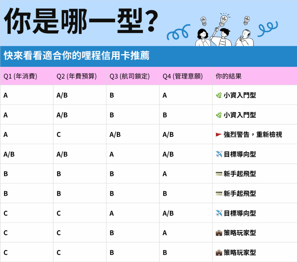 首頁 點數/哩程 【哩程新手】第一張哩程信用卡的選卡指南!用 4 題找到適合你的哩程卡 【哩程新手】第一張哩程信用卡的選卡指南!用 4 題找到適合你的哩程卡凱莉點數/哩程 2025-11-18 內容目錄 Toggle 別再盲目選哩程卡了!釐清自己的需求,才不會選錯4 個問題來幫你找出適合你的第一張卡片你是屬於哪一型的哩程卡玩家?【類型一】🌿小資入門型:零成本累積,先求有再求好【類型二】💳 新手起飛型:穩定累積,中階權益最划算【類型三】✈️ 目標導向型:聯名卡火力集中,效益最大化【類型四】💼 策略玩家型:高彈性轉點,追求極致兌換比【警告區】低消費高年費結語 別再盲目選哩程卡了!釐清自己的需求,才不會選錯 很多人踏進哩程世界的第一步,不外乎網路搜尋各種哩程卡介紹,各種必辦神卡越看越混亂、越看越不知道怎麼選;不然就就是「聽朋友說哪張卡好就辦那張」。哩程卡「沒有最好,只有最適合」。就如同投資理財一樣,每個人的起始點不一樣、資源也不一樣。如果沒有自己做功課,只一窩蜂的聽信飆股就下單,最後有極高的機率成為被割的韭菜。每張哩程卡,都會有它的優勢,也會有相對劣勢。對哩程信用卡新手來說,第一張哩程信用卡該怎麼選,不應該只看別人推薦,更重要的是重新盤點自己的需求,可以讓你享受信用卡給的福利,並盡快達成你想要的兌換獎勵,那就是最適合你的。 4 個問題來幫你找出適合你的第一張卡片 透過簡單的問題來幫你快速釐清現況,進而找到適合你的哩程信用卡!拿出紙和筆,請依序選擇最符合你個人情況的選項(例如:C, C, B, A),記下你每一題的答案吧! Q1: 你一年使用信用卡消費的總額大概落在哪個區間?A. 15 – 25 萬B. 25 萬 ~ 50 萬C. 50 萬以上 Q2: 你願意負擔的年費上限是多少?A. 0 年費,信用卡怎麼可以收年費B. 2,000 ~ 5,000 元C. 8,000 元以上 Q3: 你的旅行與消費習慣,是否已鎖定特定航司?A. 我經常搭乘特定航空公司 (華航/長榮/星宇/國泰),未來也會優先買他們的機票。B. 我搭乘的航空公司不固定,主要看價格和時間;想累積點數換多家航空公司的機票。 Q4: 對於卡片回饋與使用,你的管理意願有多高?A. 習慣固定刷一張卡,不想特別記回饋方式或是切換回饋類別。B. 願意花時間切換消費回饋類別,或花時間研究轉點活動。 你是屬於哪一型的哩程卡玩家? 【類型一】🌿小資入門型:零成本累積,先求有再求好 核心特徵與判斷邏輯年度信用卡消費低,暫時不考慮使用信用卡要付年費。策略分析因為年度信用卡消費不高,你的目標是零成本開始累積,先熟悉一下哩程怎麼玩。累積速度慢一點沒關係,重點是沒有金錢負擔! 匯豐旅人輕旅卡 策略: 閉著眼睛刷就好,不用思考!優勢: 0 年費,國內&海外消費 20 元 1 哩。 點這裡辦卡 國泰 CUBE 卡 如果你 Q4 是回答 B,請選這張卡!策略: 願意花點時間換取更高的回饋!警告: 請答應凱莉要記得切換權益! 如果你一懶,刷到非加倍類別,回饋會超少,看到會捶心肝! 點這裡辦卡 【類型二】💳 新手起飛型:穩定累積,中階權益最划算 核心特徵與判斷邏輯平均每個月使用信用卡的消費金額超過 $20,000,且也願意負擔一點信用卡年費來享受相對應的福利。策略分析年費不高,但你的消費量足以輕鬆賺回付出的年費,還能享受基本的貴賓室、接送權益。重點要選回饋好且權益超實用的卡片!凱莉叮嚀⚠️ 記得計算你的年費和附帶權益價值(像是單次機場接送約 $1,000),並確認這些權益你會使用到,確保你賺回來的東西比付出的年費還要多! 滙豐旅人御璽卡 策略: 中階卡中的 CP 值之王,穩定且可以選擇彈性轉哩程至 16 家航空公司。 優勢: 年費 $2,000,國內消費 18 元 1 哩,海外消費 15 元 1 哩,累積效率比輕旅卡好,而且會附贈免費機場接送/貴賓室等權益,用二次年費就回本了!缺點是沒有悠遊卡功能~ 點這裡辦卡 星展飛行世界商務卡 策略: 適合預計要花很多時間才能換到目標機票的朋友!優勢: 年費 $3,600,國內消費 20 元 1 哩,海外消費 15 元 1 哩,犧牲一點回饋率,換來哩程不過期(持卡期間哩程皆有效)!不用擔心哩程過期壓力,可以慢慢累積。 點這裡辦卡 【類型三】✈️ 目標導向型:聯名卡火力集中,效益最大化 核心特徵與判斷邏輯平常的飛行習慣已經鎖定特定航司,追求聯名專屬權益(優先登機、貴賓室)和購買機票回饋加碼。策略分析你就是知道自己想搭誰!這時候聯名卡就是你最強的武器!能把你的飛行哩程和刷卡哩程合在一起,幫你超快達標! 長榮航空|國泰世華聯名卡 購票最優 9 折購票享有哩程加倍優先劃位(無限卡) 點這裡辦卡 中華航空|中國信託華航聯名卡 華航金卡會籍機場專屬櫃檯額外免費托運行李 點這裡辦卡 國泰航空|亞洲萬里通聯名卡 哩程加速器特約活動優先兌換獎勵機票哩程效期滾動制 點這裡辦卡 星宇航空|玉山星宇航空聯名卡 優先劃位/報到生日月哩程加倍(活動需登錄且鈦金卡不適用) 購票/機上免稅品購買優惠 點這裡辦卡 【類型四】💼 策略玩家型:高彈性轉點,追求極致兌換比 核心特徵與判斷邏輯年度消費高且對於信用卡的年費接受程度也高。策略分析你屬於是哩程世界的玩家了,能理解年費跟回饋之間的相對關係,年費對你來說根本是投資!你的目標是利用高彈性卡累積積分,在航空公司大放優惠時,再轉點換到最划算、最豪華的機票!建議可以搭配彈性哩程卡與航空公司聯名卡一起使用,多