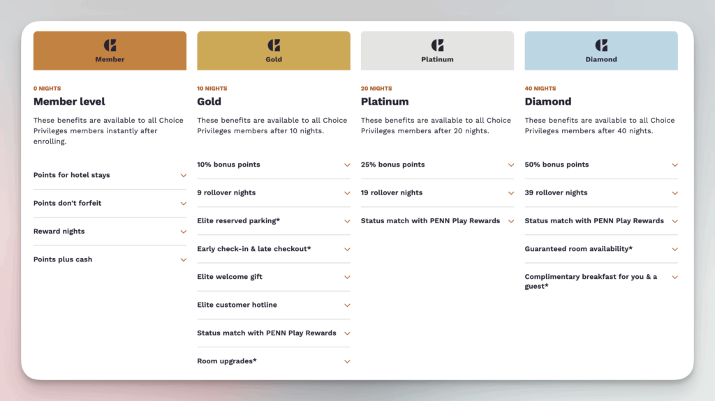 Choice Privileges 是 Choice Hotels 的常旅客計劃的名稱 aka VIP 計畫。跟大步部分的會員計劃雷同,不外乎根據旅客的住宿頻次,將其作不同等級的區分。別是一般、金、白金、鑽石四個等級。在不同級別的消費,可以拿到不同對應的點數,而且點數可以用來兌換住宿。