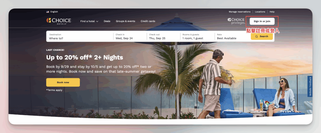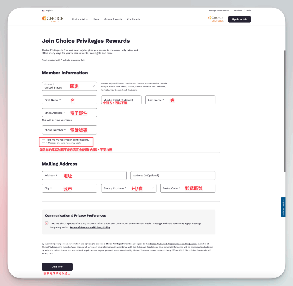 ❶ 進入 Choice Hotels 官網找尋加入會員或是 點擊此連結 進入會員申請頁面