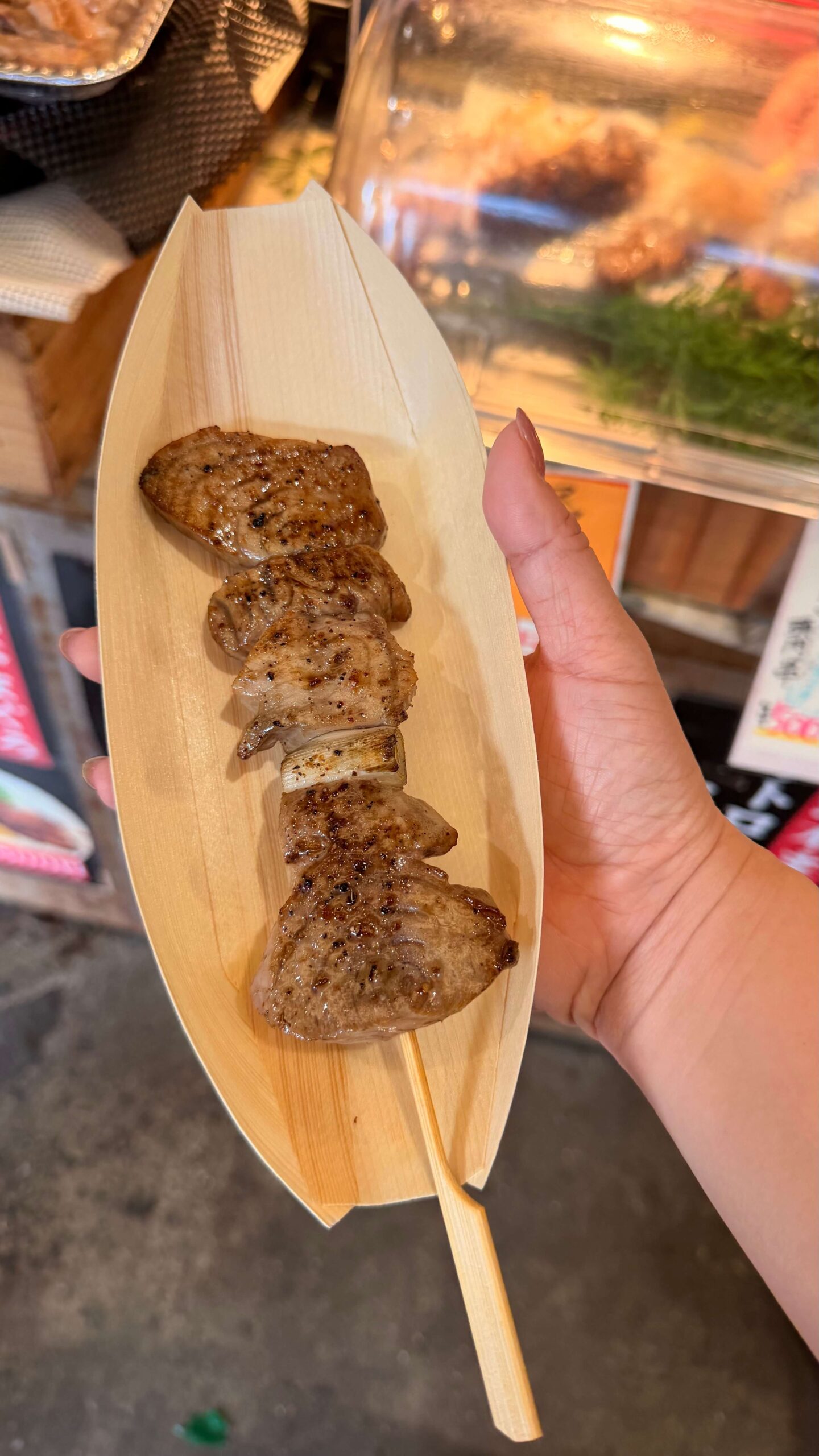- 九州鮪魚攤位有現烤的鮪魚「頭」這個部位的烤肉,吃起來很多汁,口感有點像牛排