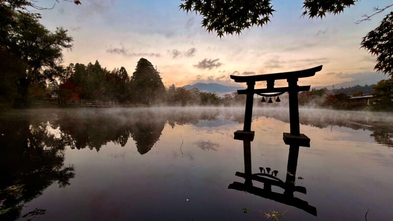 - 秋天黃昏時可以看到夕陽打再由布岳上,金鱗湖會倒映一片金黃也很美